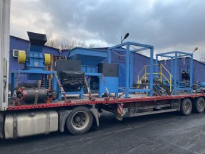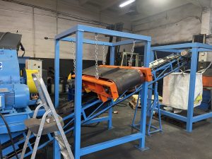 Die Aufgabe des vorgestellten Satzes besteht darin, die PVC-Fensterprofile zu mahlen. Durch die Verwendung einer Zweiwellenmühle können wir Profile mit einer Länge von bis zu 5 Lfm vormahlen. Der nächste Schritt ist das Zerkleinern / Mahlen des Materials mit einem Hammerbrecher. Dank der Verwendung dieses Gerätetyps erhalten wir zwei Produkte: gereinigter Stahl und PVC-Granulat. Der Magnetabscheider hat die Funktion der Rückgewinnung von Stahl aus PVC.